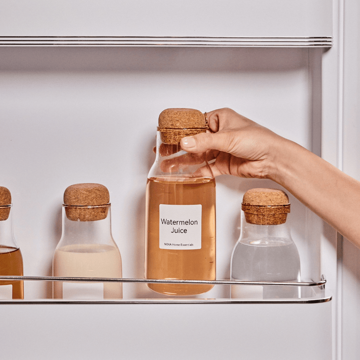 This versatile Glass Carafe with Cork Stopper is perfect for a wide range of beverages, including water, milk, iced tea, fruit-infused juices, and more. It's also suitable for hot drinks and features a slim design with a convenient stopper, making it ideal for fridge door storage.